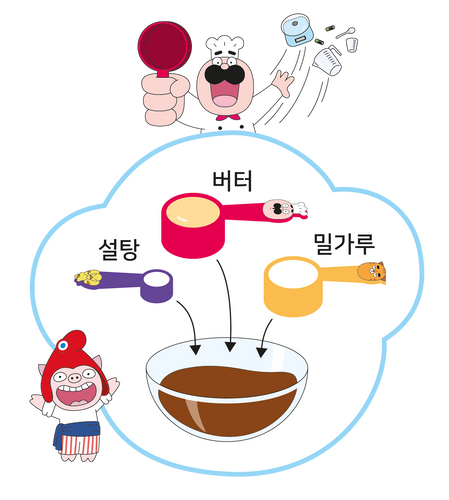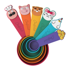 셰프클럽 프렌즈는 기존의 계량단위 그램, 리터, 밀리미터를 다양한 크기의 컵으로 대체한 새로운 계량법을 선사합니다. 예를 들면 우유 250ml를 계량하는 대신 셰프가 그려진 컵을 가득 채우면됩니다. 셰프, 고양이, 돼지, 쥐, 닭 그리고 병아리들로 각각 다른 캐릭터가 새겨진 6개의 컵들은 크기와 용량이 달라요.